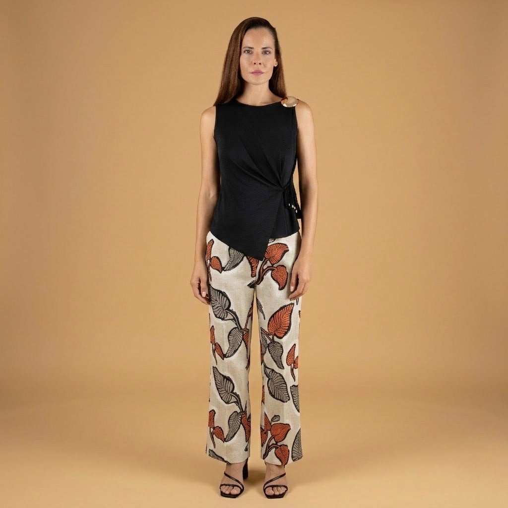 Esta blusa cuenta con un cuerpo de cuello redondo y un diseño cruzado con drapeado lateral. Presenta un detalle de gran botón dorado en el hombro y un cierre mediante lazada fina en la cintura.