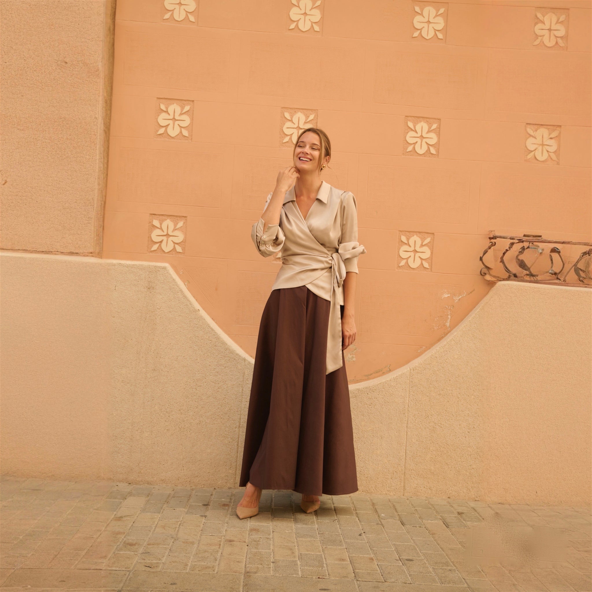 Esta blusa cruzada con una lazada, cuello camillero y mangas francesas.