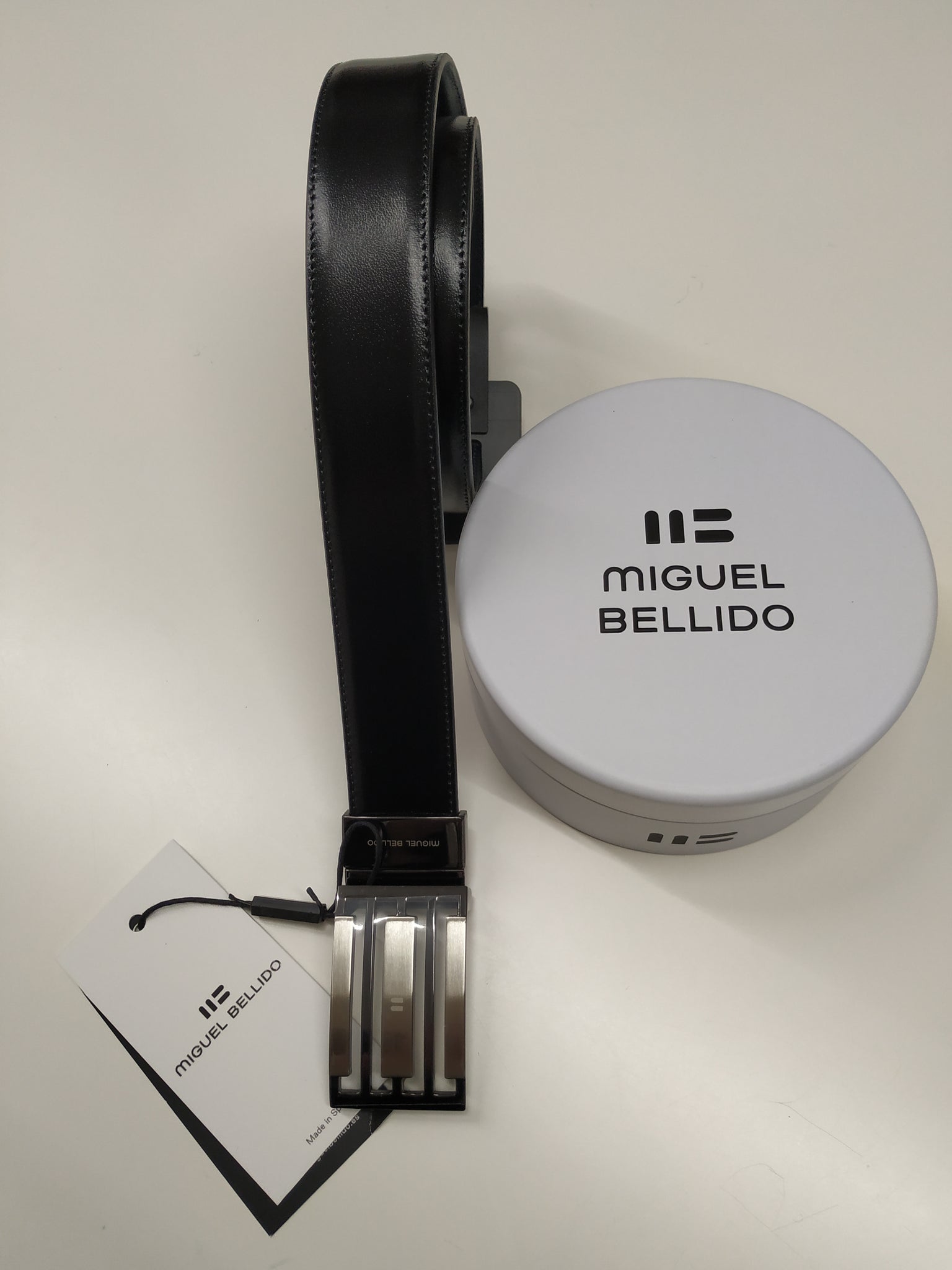 Cinturón reversible plano con pespuntes, hebilla de pinza auto-contable, incluye sistema fácil de corte para adaptar a la medida deseada.