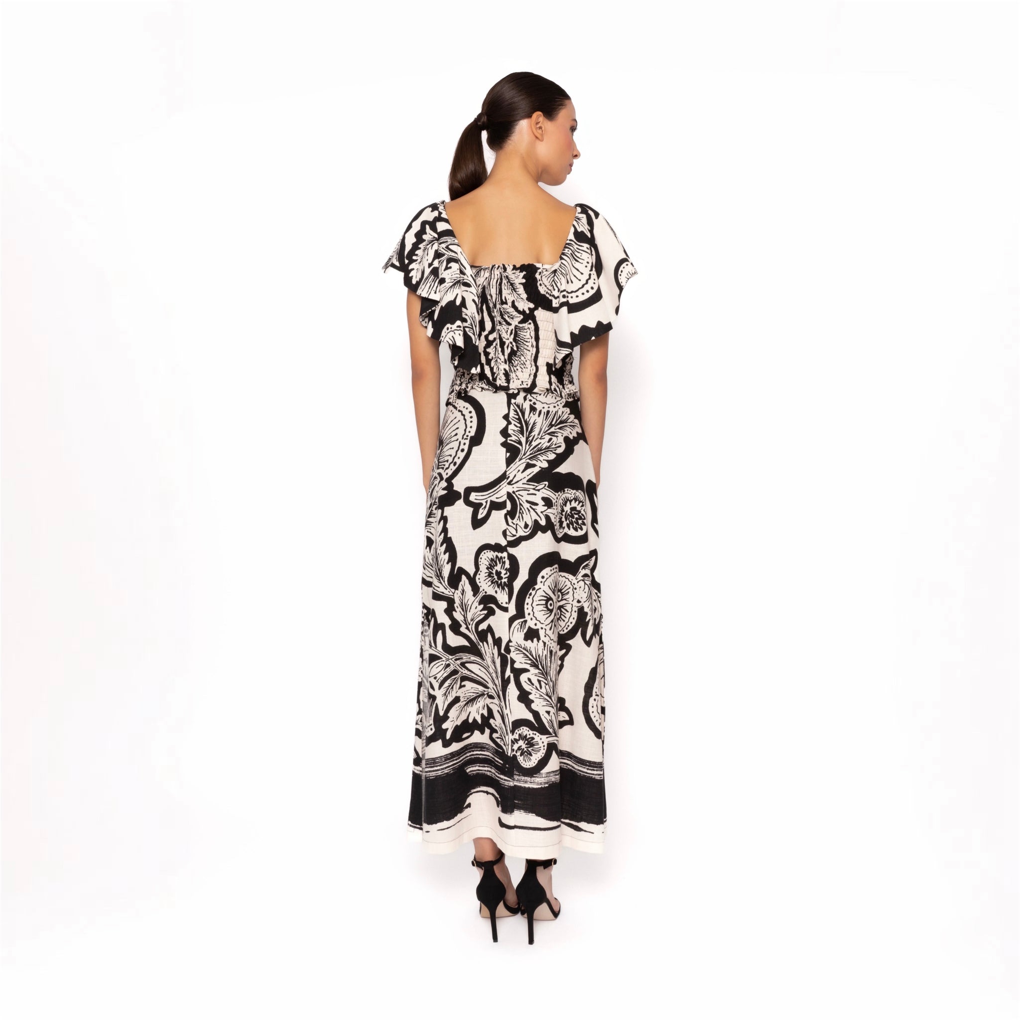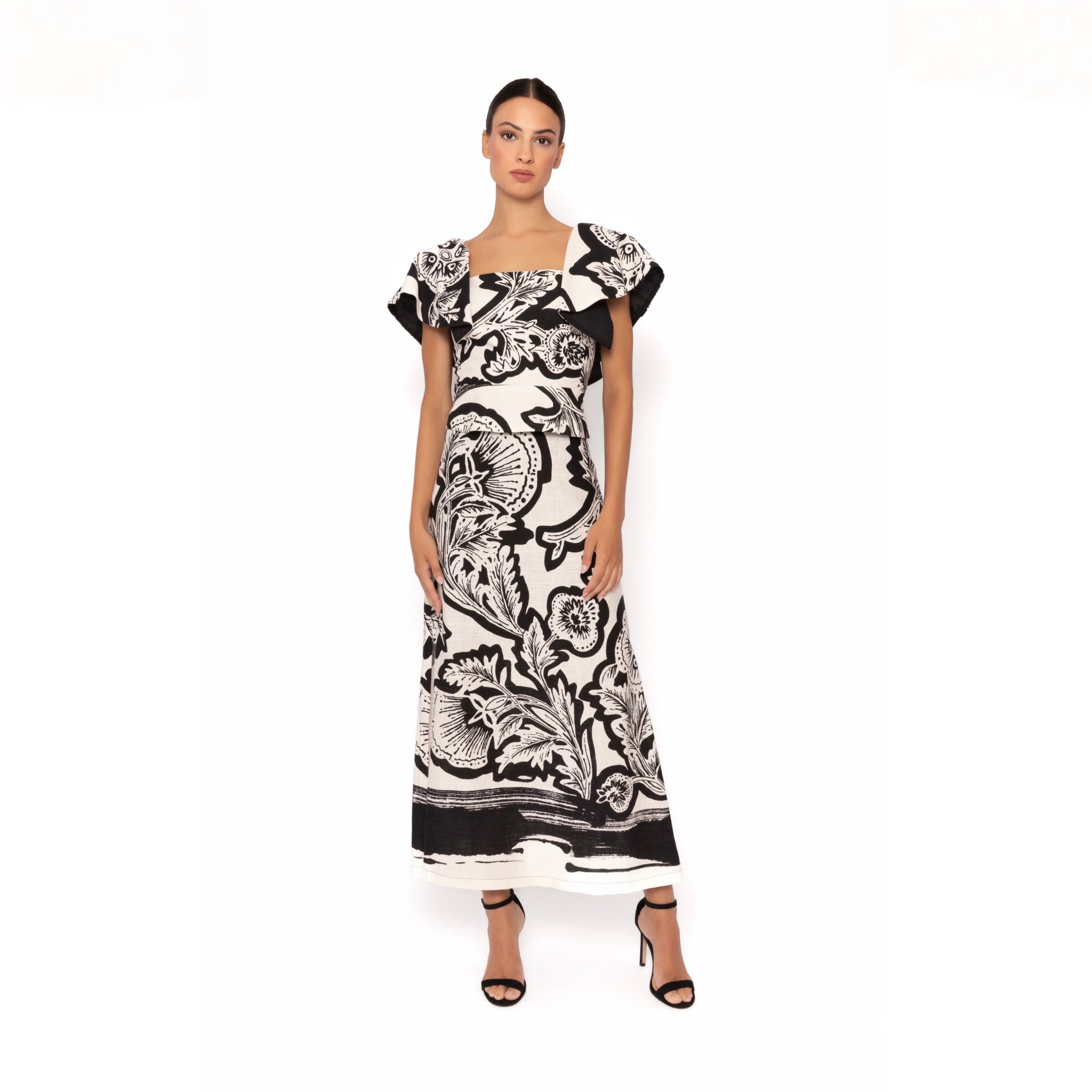 Este conjunto estampado cuenta con un cuerpo ajustado, tirantes con manga caída, una elegante falda recta con abertura por detrás.
