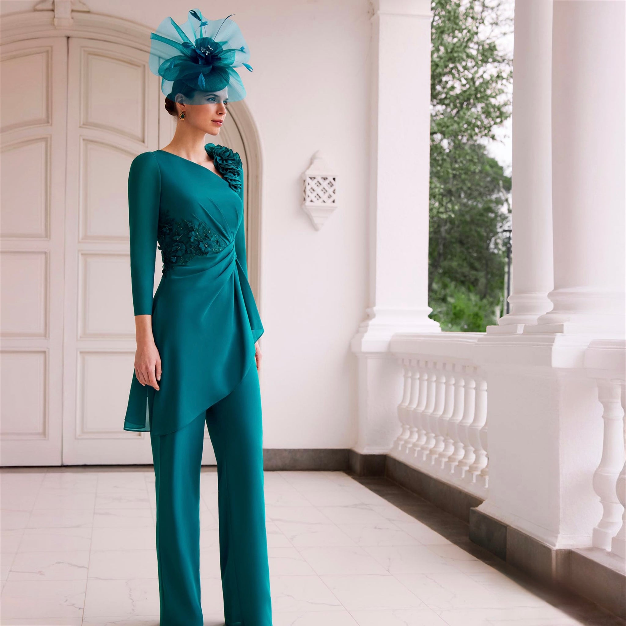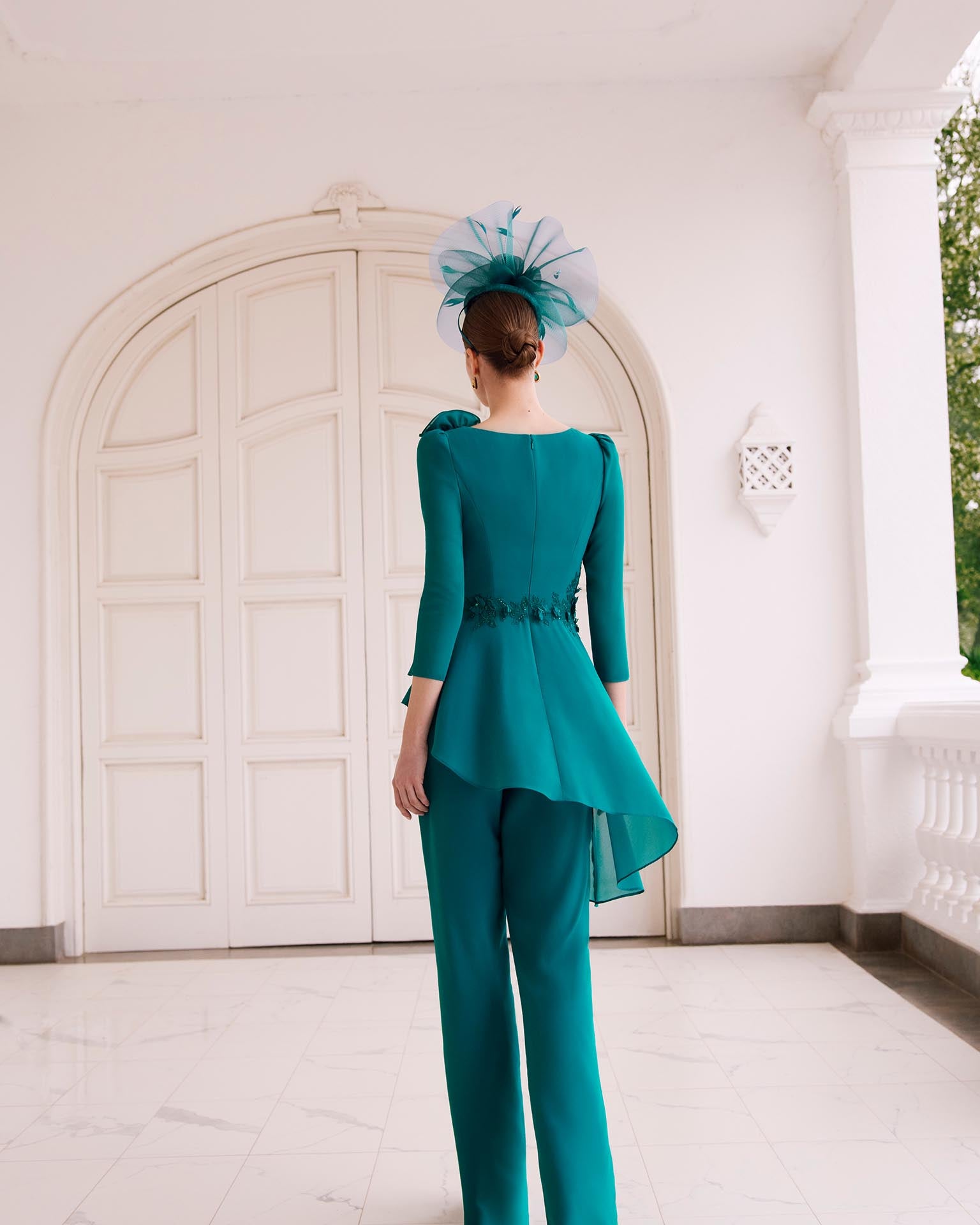 Este conjunto cuenta con una blusa y pantalón de fiesta, dos piezas confeccionado en gasa. Con escote asimétrico, manga larga y espalda cerrada