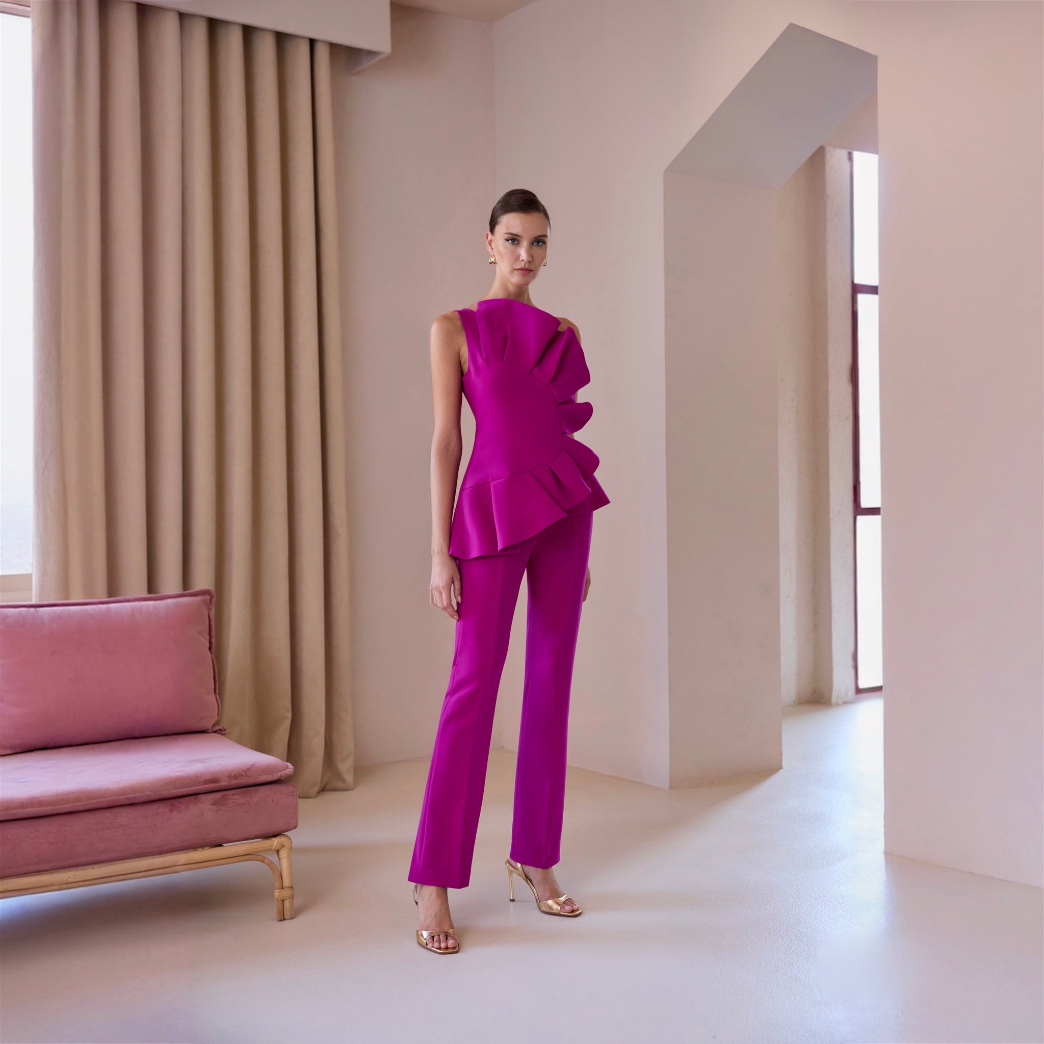 Este conjunto cuenta con un cuerpo asimétrico con un elegante volante de pliegues que sale desde el hombro hasta la cintura, y un elegante pantalón de pata recta.