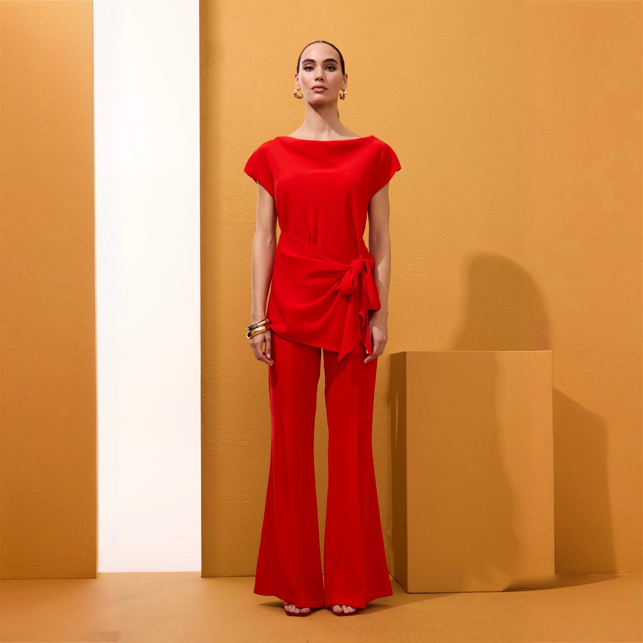 Este conjunto cuenta con un cuerpo en cuello de barco y mangas caídas con una elegante lazada en la cintura, un elegante pantalón en pata ancha.