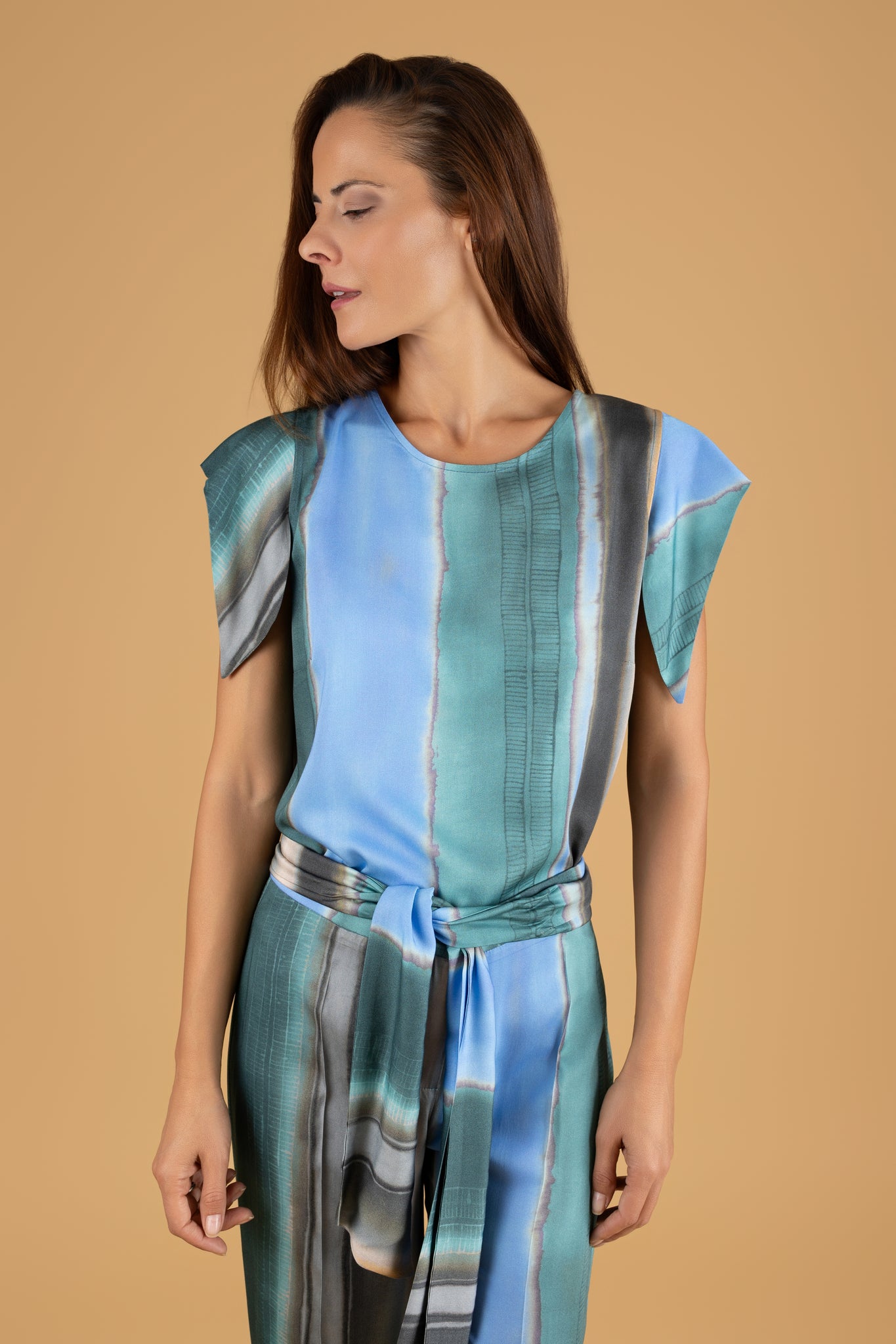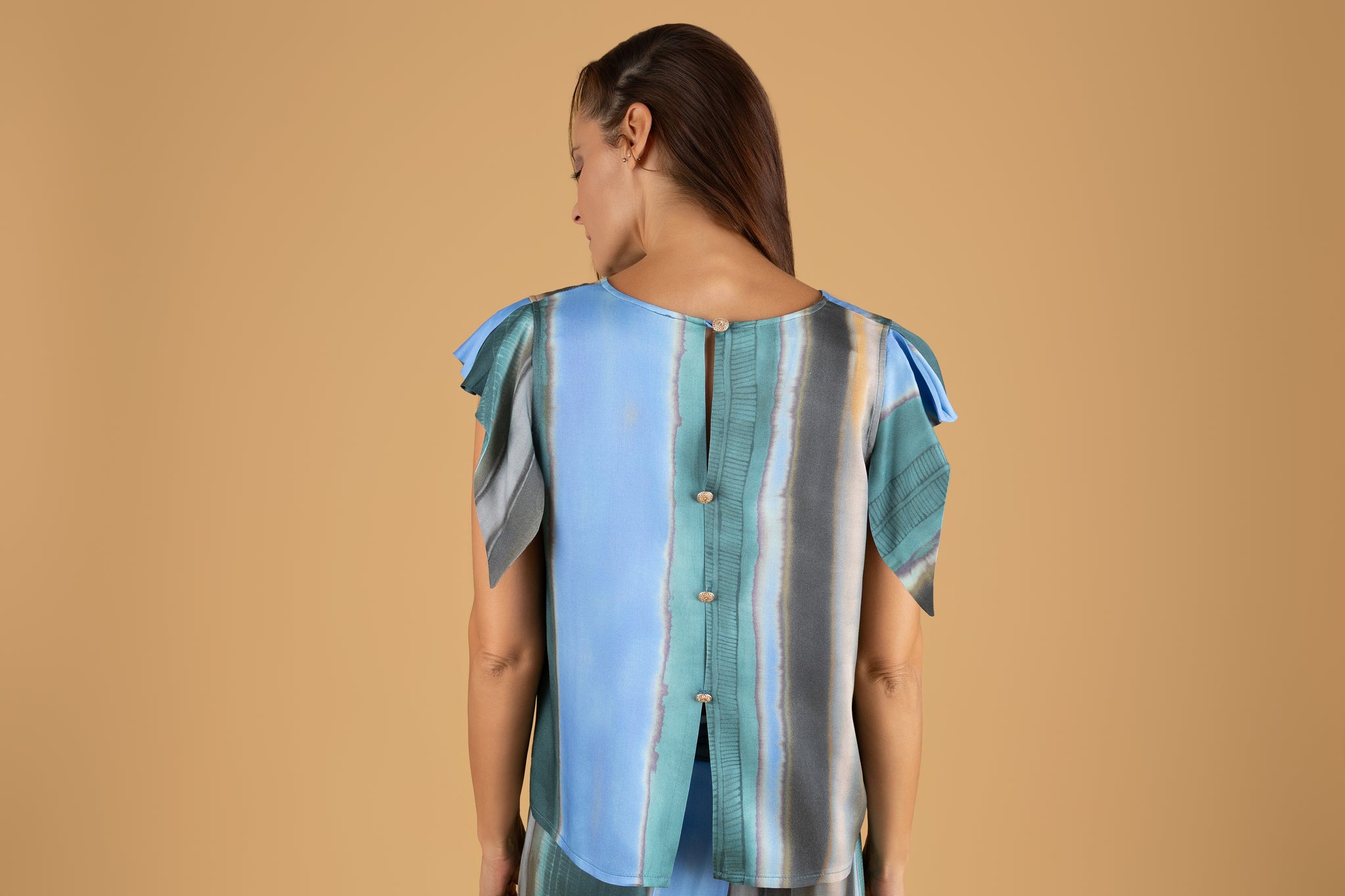 Este conjunto presenta un diseño de rayas verticales con un cuerpo de cuello redondo. Además, cuenta con una cinta a modo de cinturón y detalle de botones dorados en la espalda.