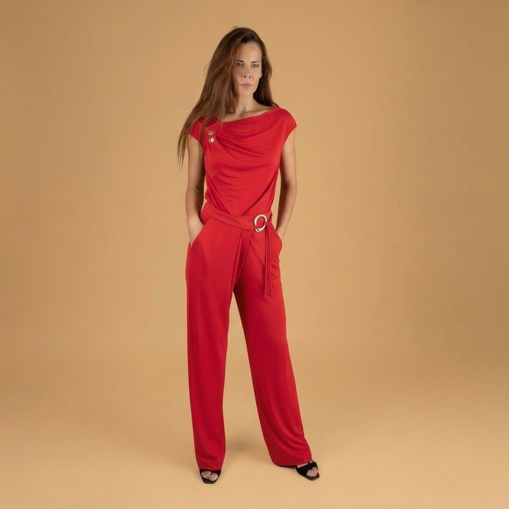 Este conjunto presenta un escote asimétrico drapeado con detalles de botones dorados. Incluye un cinturón con una gran hebilla circular dorada que ciñe la cintura. El pantalón es de pierna ancha y cuenta con bolsillos.