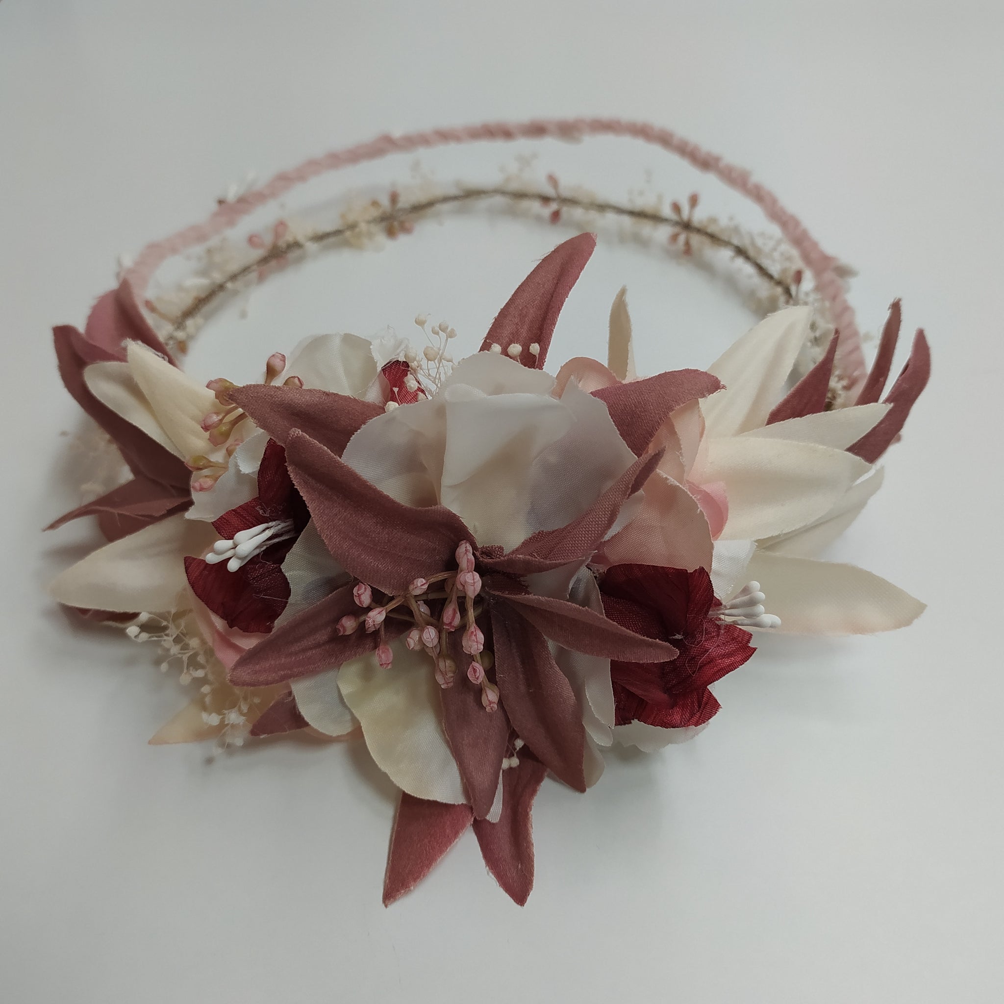 Confeccionado en Flores varias texturas tonos beig, rosa y granate.