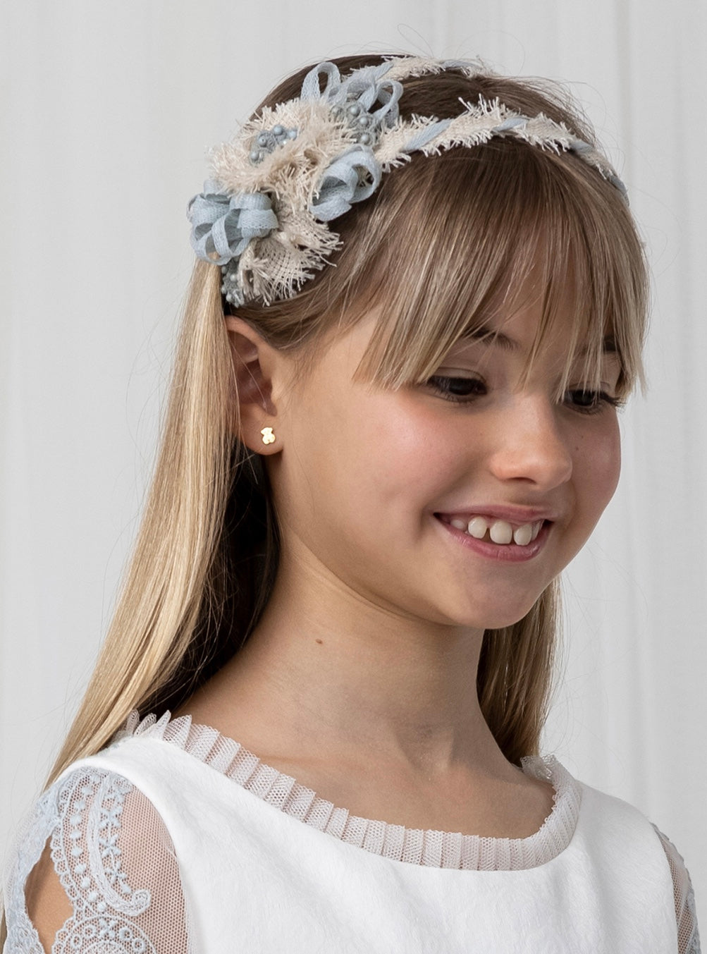 Diadema combinada en rafia, tela y tul, ajustable con lazada en tul.