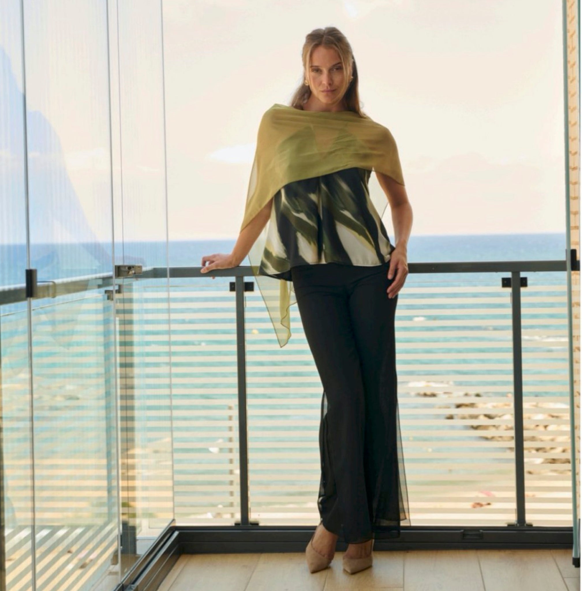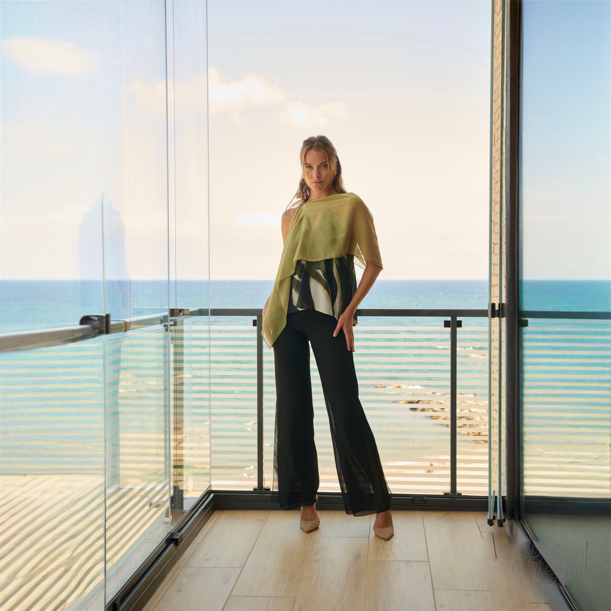 Este pantalón pata recta en gasa con 2 capas la de arriba con abertura.
