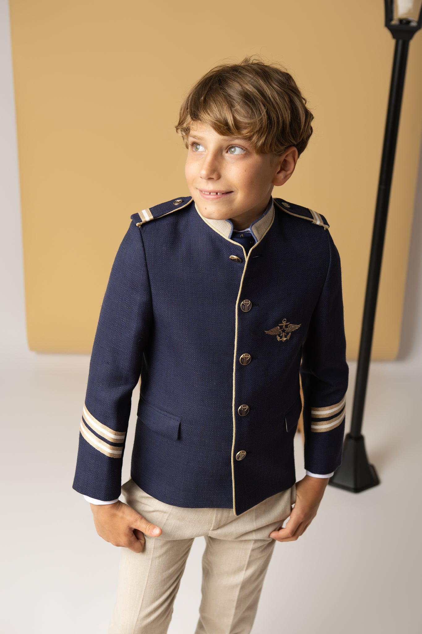 Este traje almirante de cuello mao, chaqueta combinada marino y tostado con 5 botones, chaleco beige con vivo azul, corbata marino con adornos en letras, camisa incluida, con un elegante pantalón arena de esterilla.