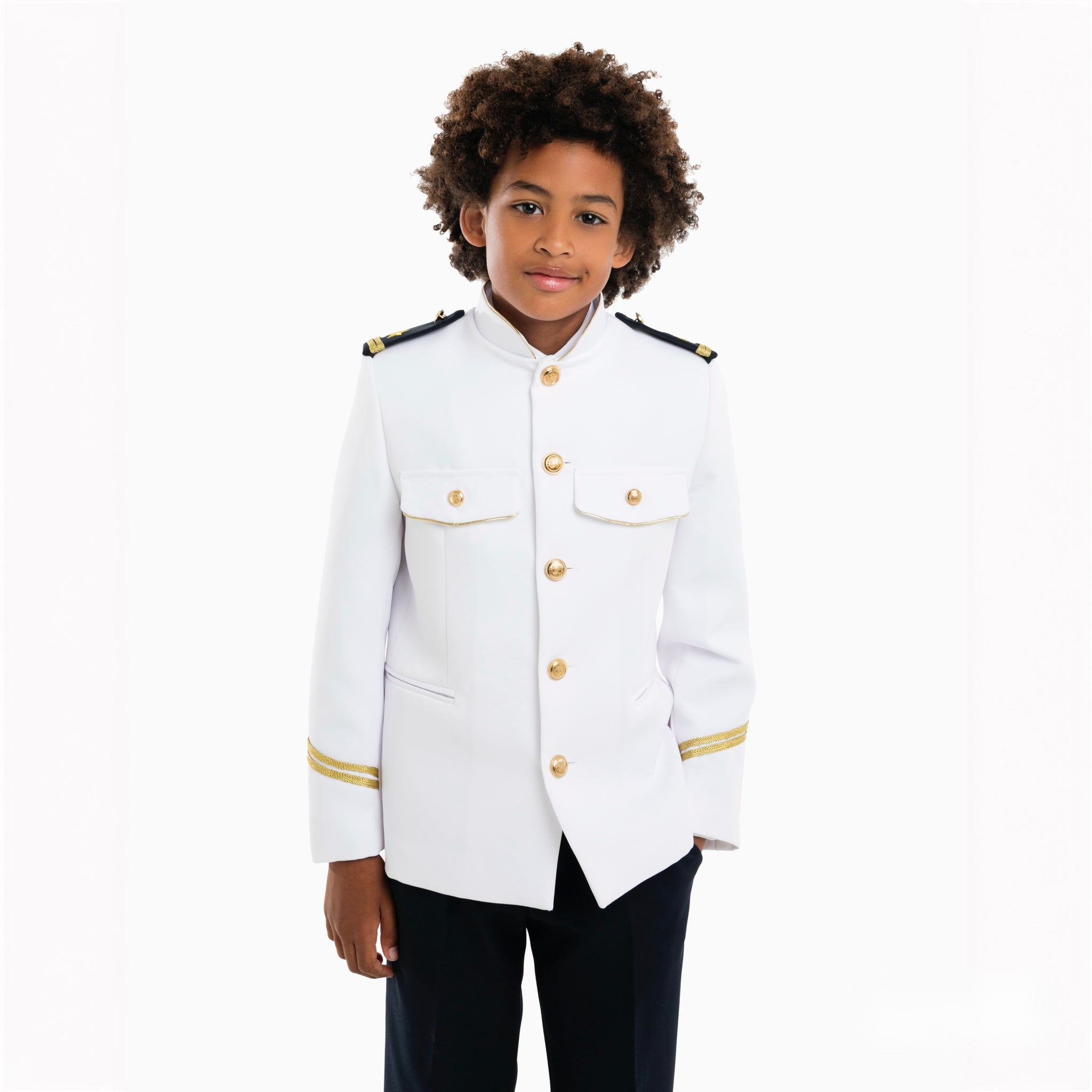 Este traje almirante incluye chaqueta con cinco botones blanca, cuello mao ,camisa blanca, pantalón azul marino, chaleco brocado en dorado con dibujo, corbata en azul marino con anclas. Elegante por excelencia.