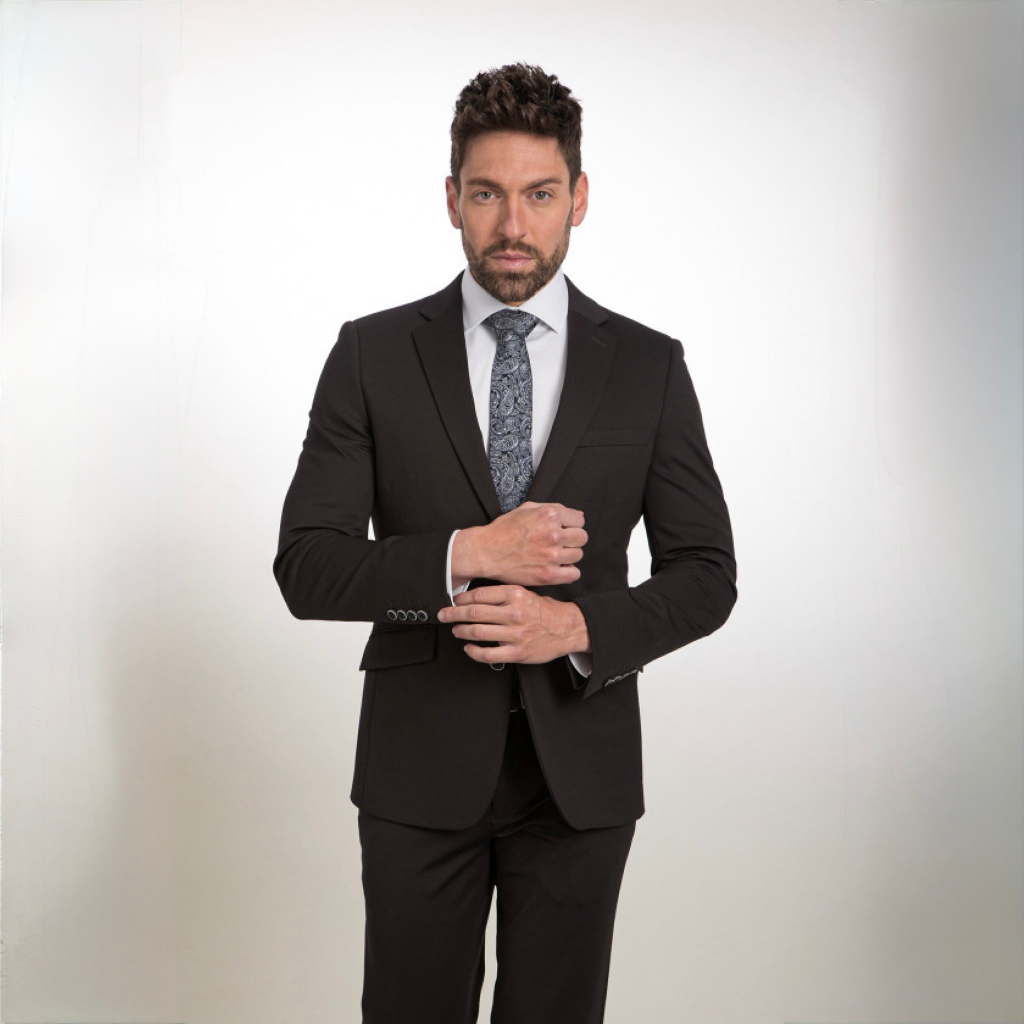 Traje de corte SUPER SLIM FIT, Americana con solapa picada al canto y dos pinzas en el delantero, pantalón de tiro corto con cinturilla elástica adaptable.
