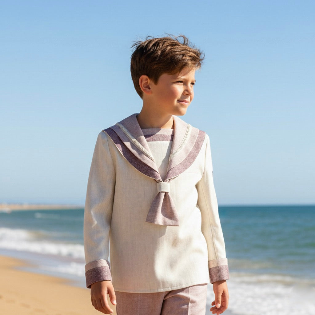 Este traje cuenta con una casaca combinada en beige y burdeos, un elegante pantalón burdeos.