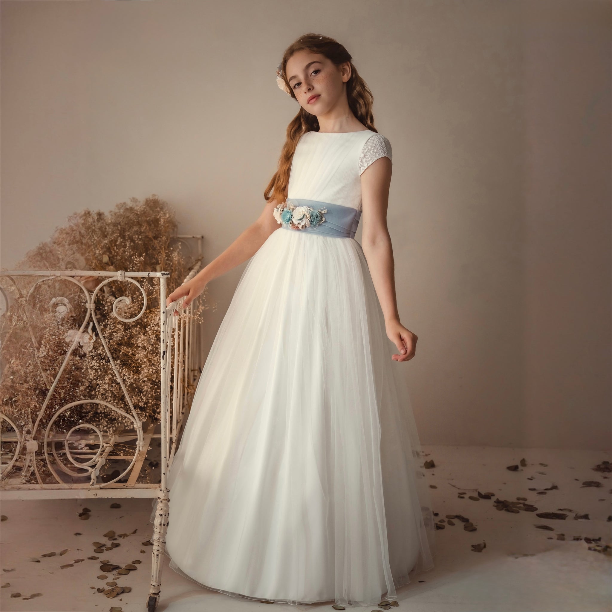 Este vestido cuenta con un cuerpo por delante liso y una espalda y mangas bordados que realza la figura, falda lisa de tul. Como detalle final fajín azul con lazada en la espalda y detalle de flores por delante