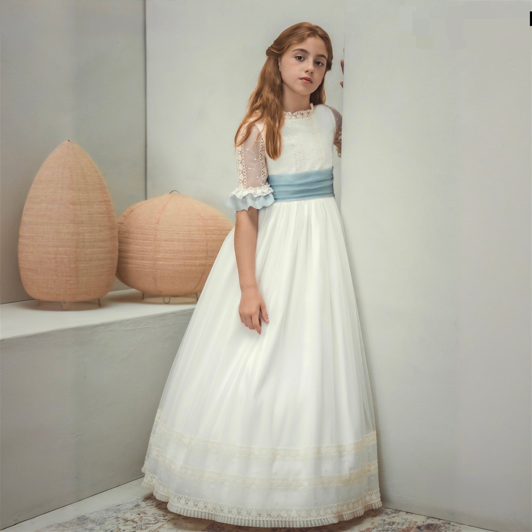 Este vestido cuenta con un cuerpo bordado que realza la figura, mangas de tul bordadas con detalle final en ondas que aportan un toque sofisticado, y una espalda combinada para un acabado espectacular, falda de tul con final bordado. Como detalle final fajín azul con lazada en espalda