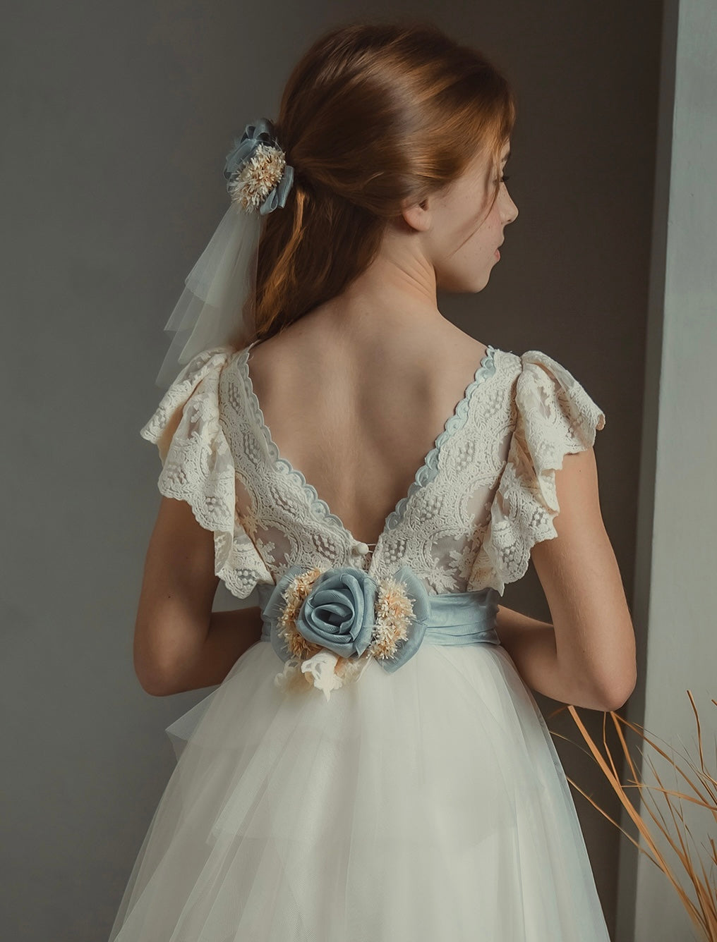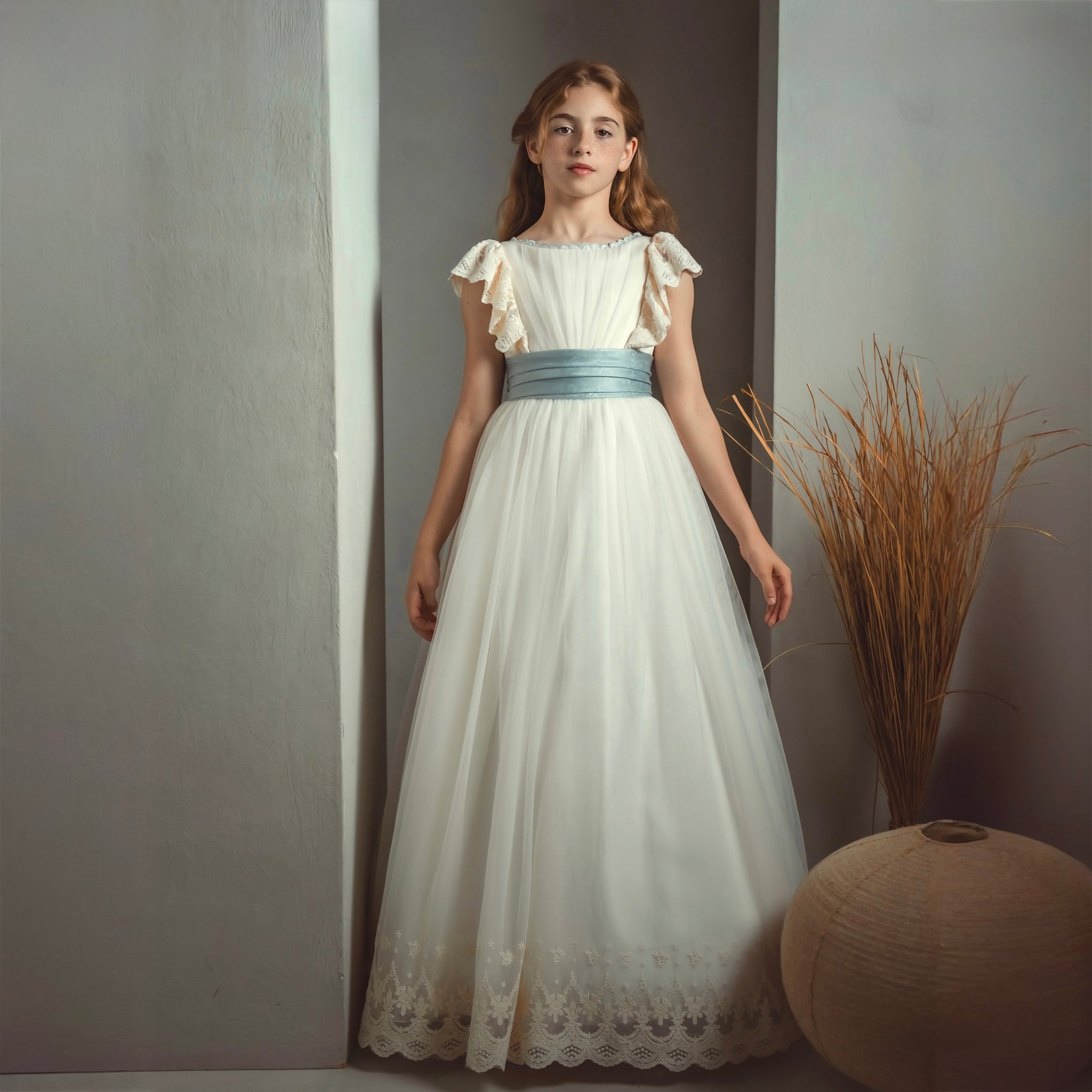 Este vestido cuenta con un cuerpo de tul liso por delante con un fruncido que realza la figura, con unas mangas diferentes bordadas para darle un toque sofisticado, y una espalda de en V bordada con delalles, falda de tul con final bordado. Como detalle final fajín en tablas azul con flores en espalda