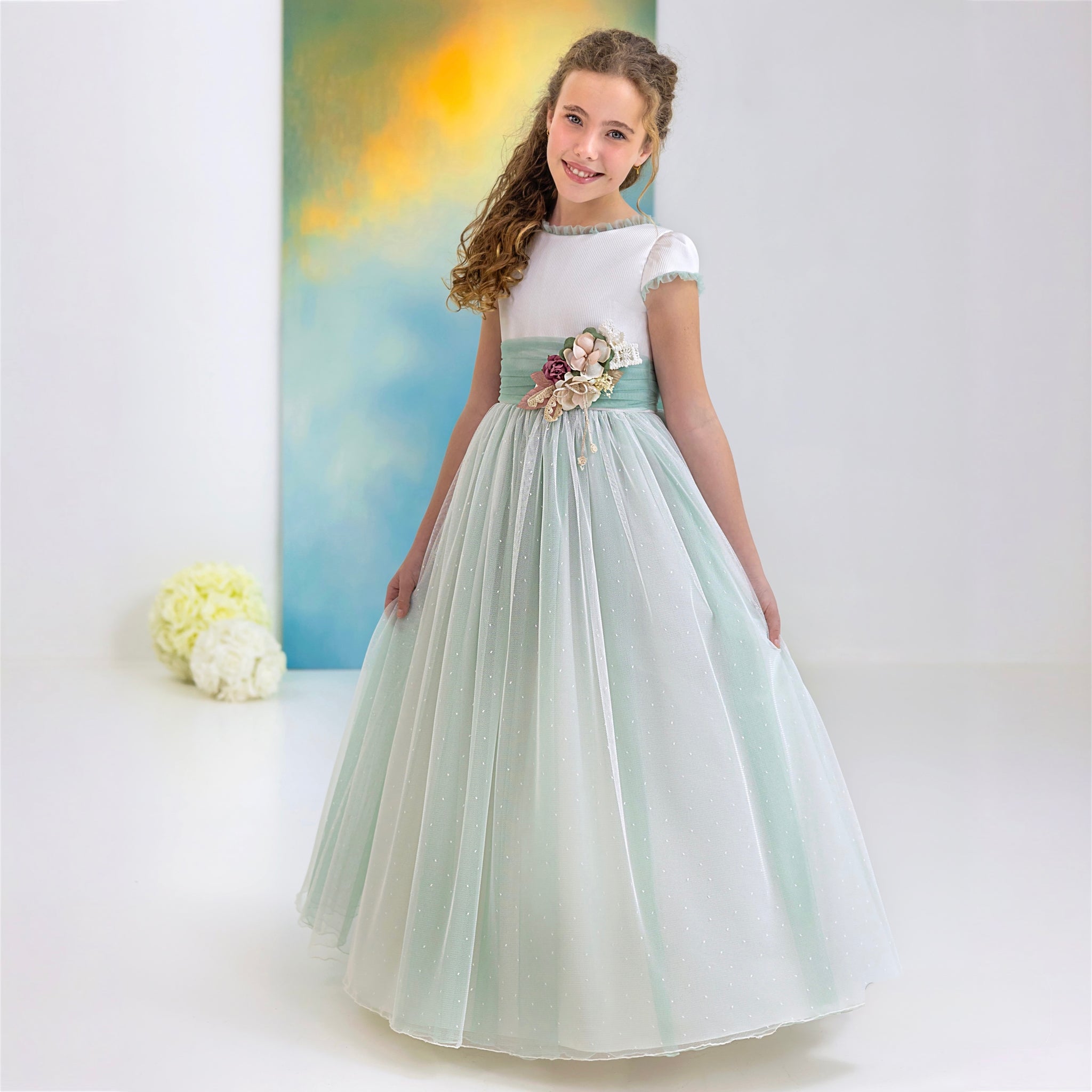 Este vestido cuenta con un cuerpo falso liso y volante pequeño en el escote de tul que realza la figura, mangas cortas lisas con final en volante pequeño de tul y una espalda en V para un acabado espectacular, su falda de tul con pequeños topos y un toque de color. Como detalle final fajín de tul verde con su elegante lazo en espalda y una flor delante.