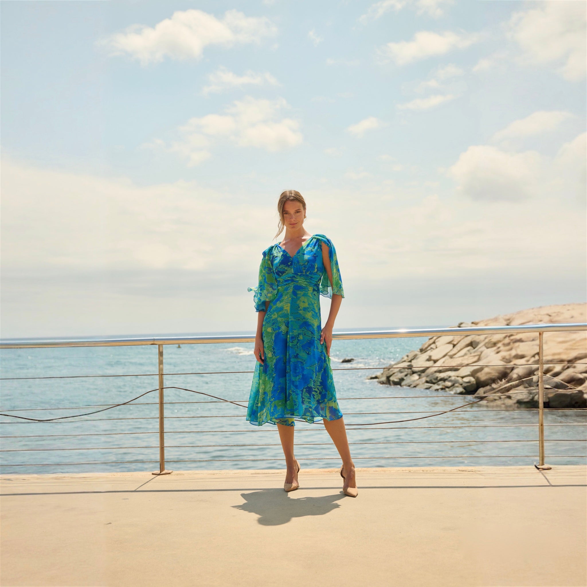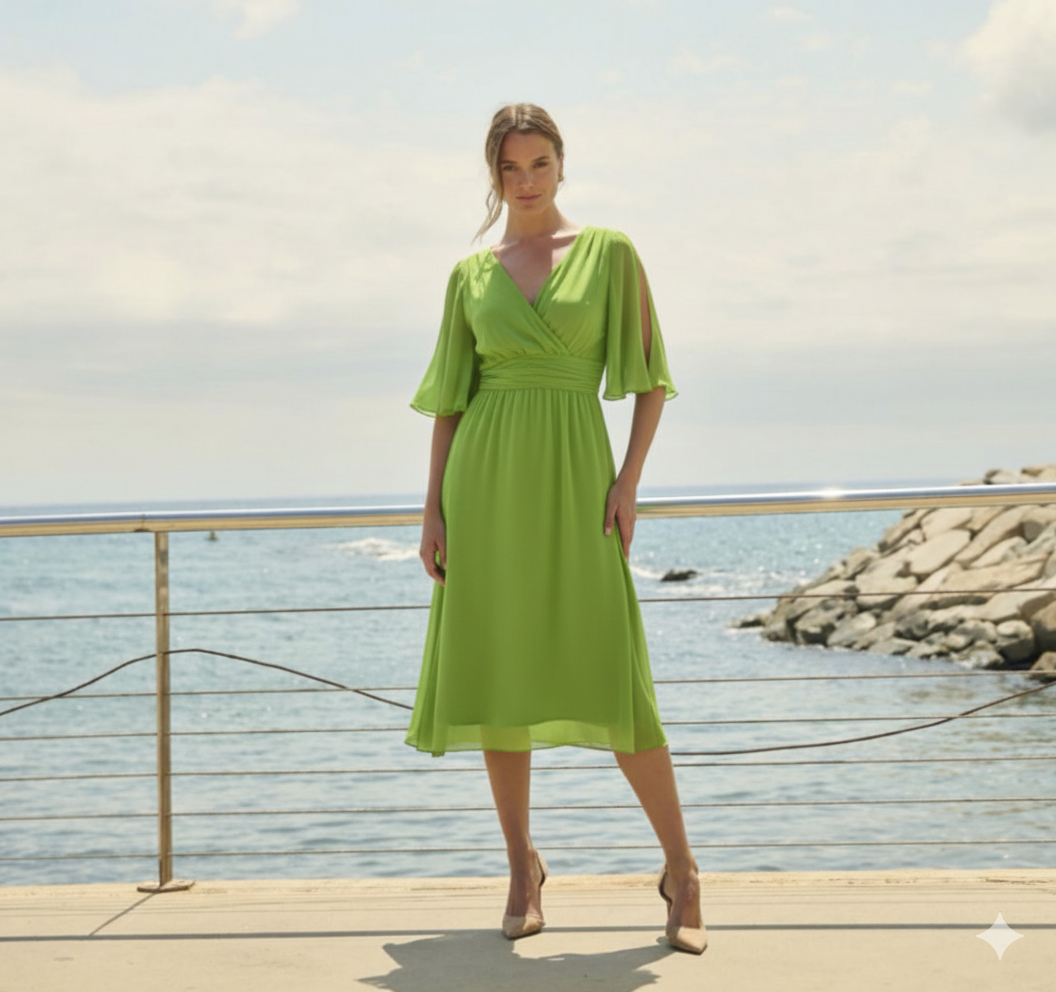 Este vestido liso en gasa cuenta con un cuerpo de escote cruzado, mangas francesas de capa y falda evasé