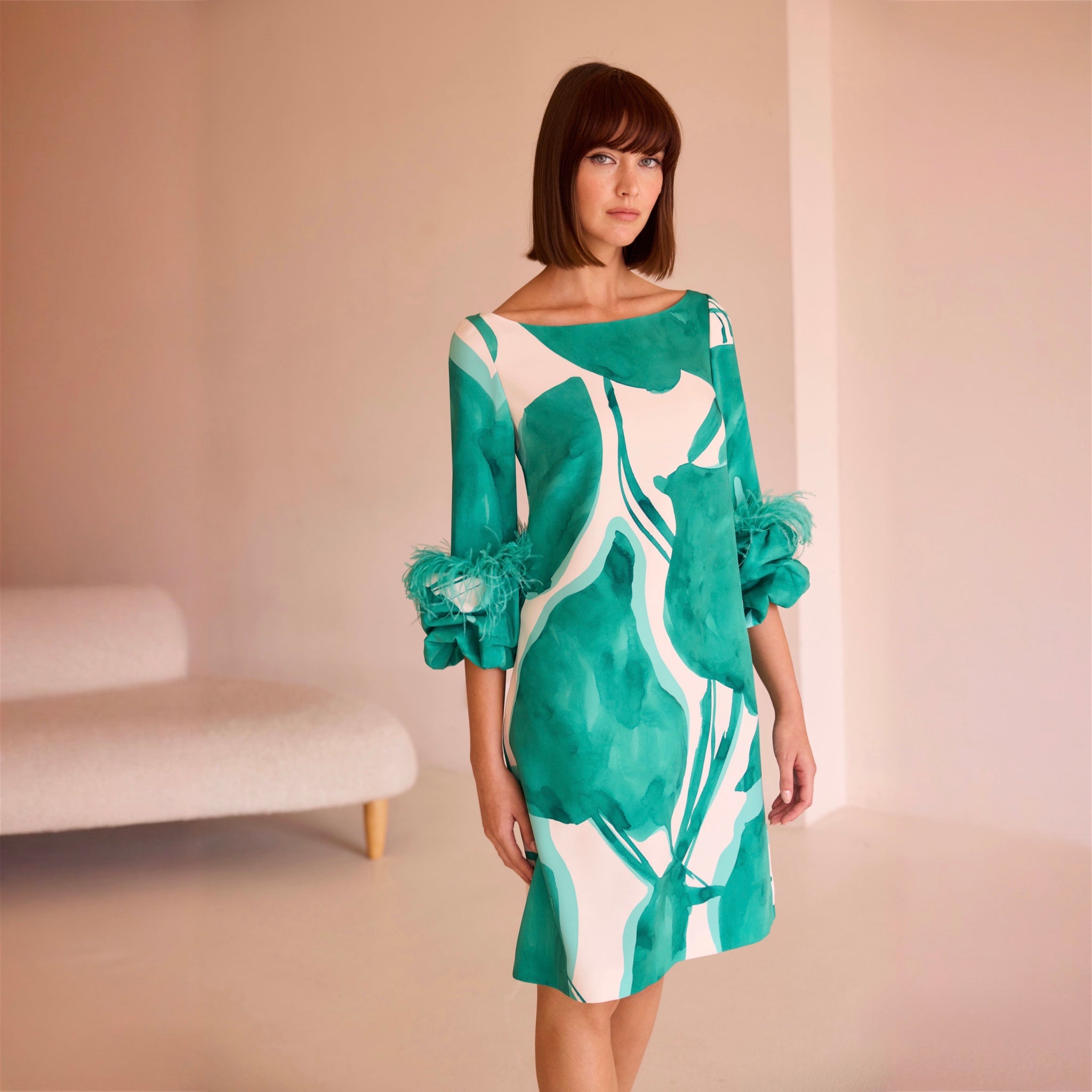 Este vestido recto estampado cuenta con un escote barco, mangas francesas final abollonadas y plumas, bolsillos en los lados.