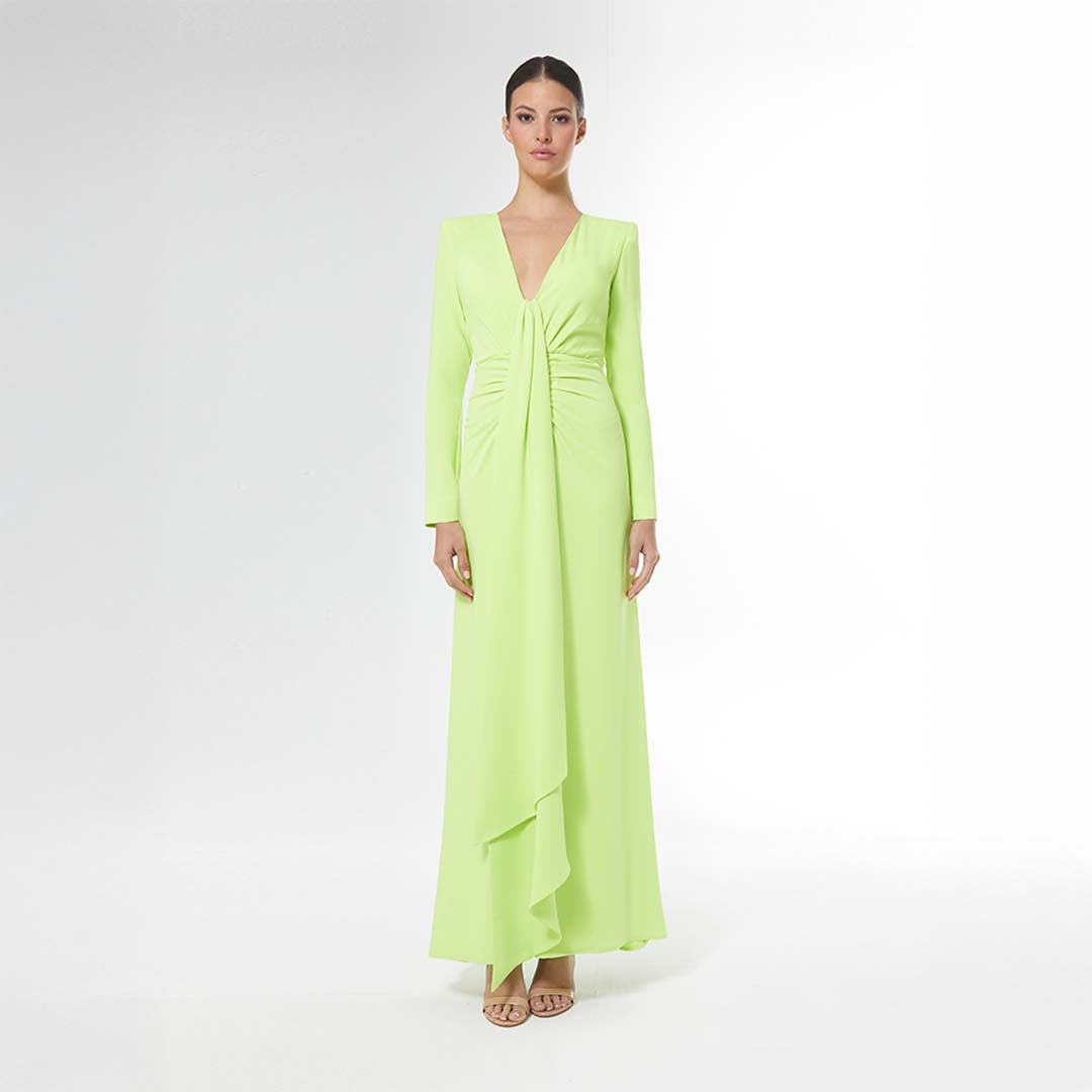 Este vestido con escote de pico desde donde sale una lazada, con manga larga y falda terminada en bucle.