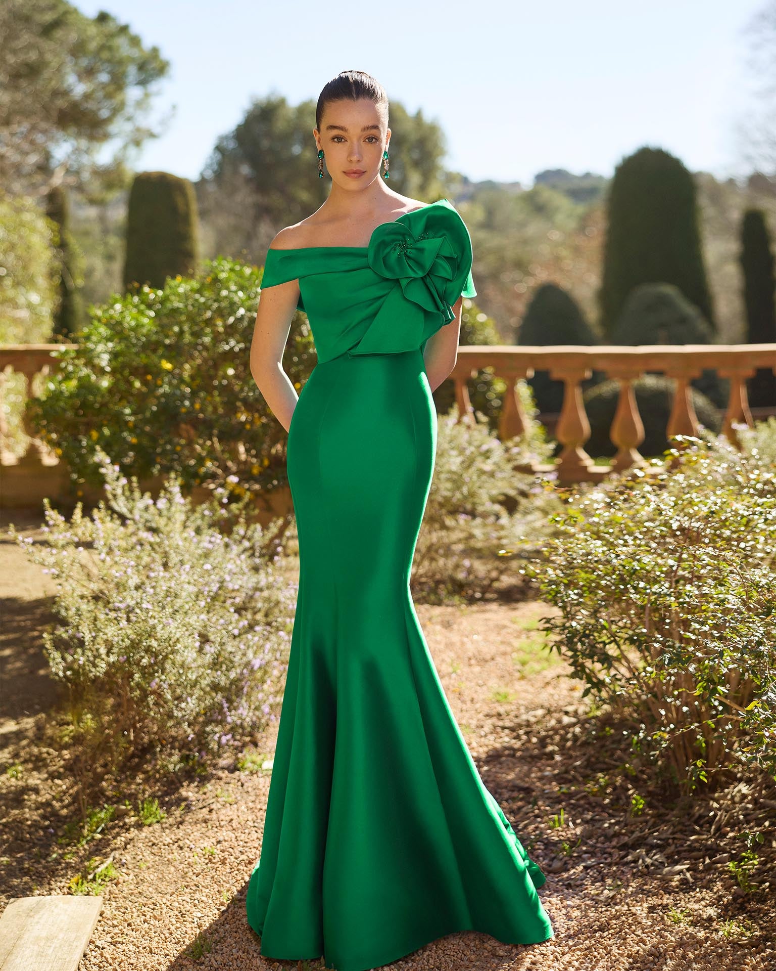 Este vestido de fiesta largo. Confeccionado en mikado. Escote envolvente y espalda con cremallera. Incluye chal