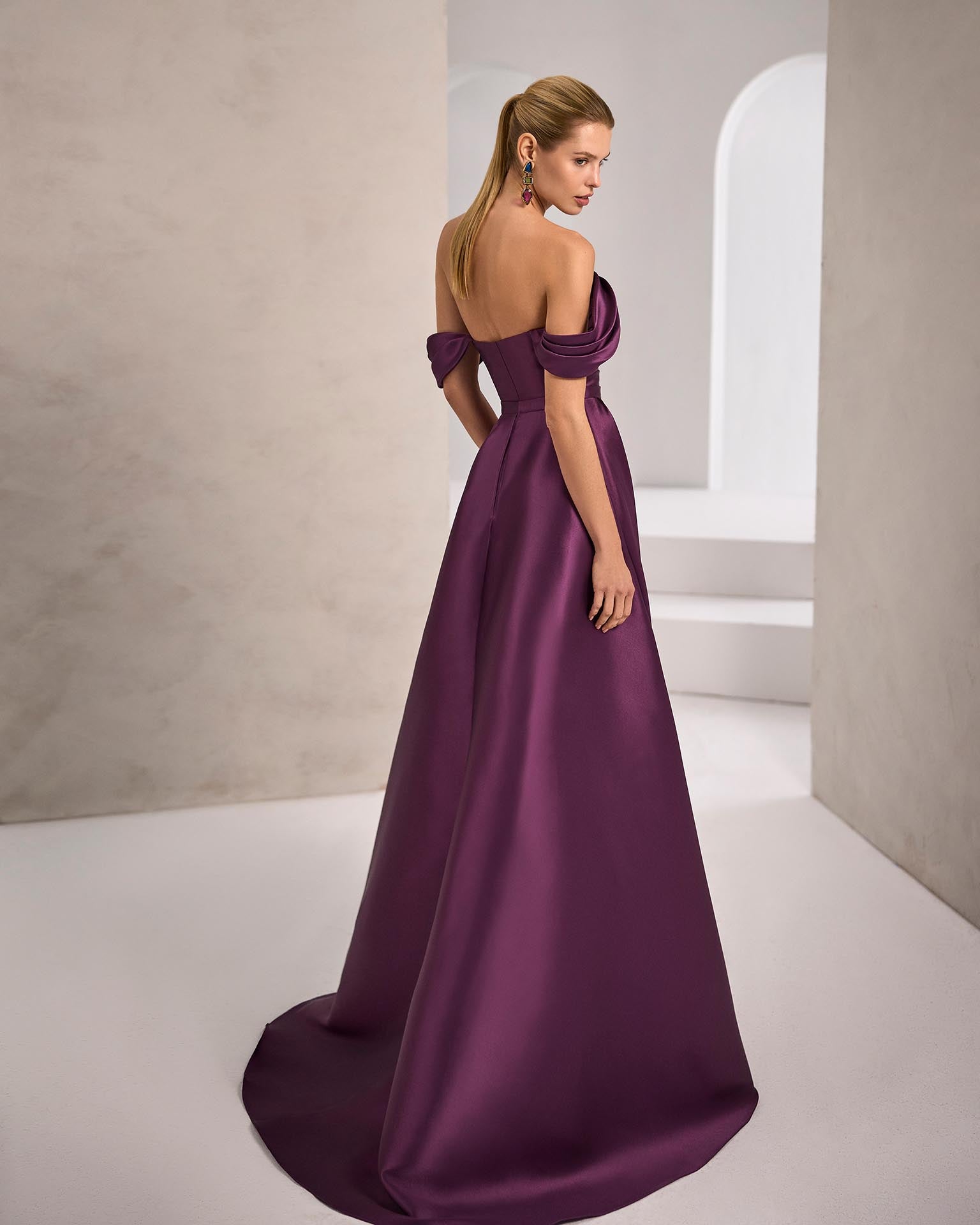 Este vestido de fiesta largo dos piezas, confeccionado en tul bordado con pedrería, con escote palabra de honor y tirantes caídos, sobrefalda y chal