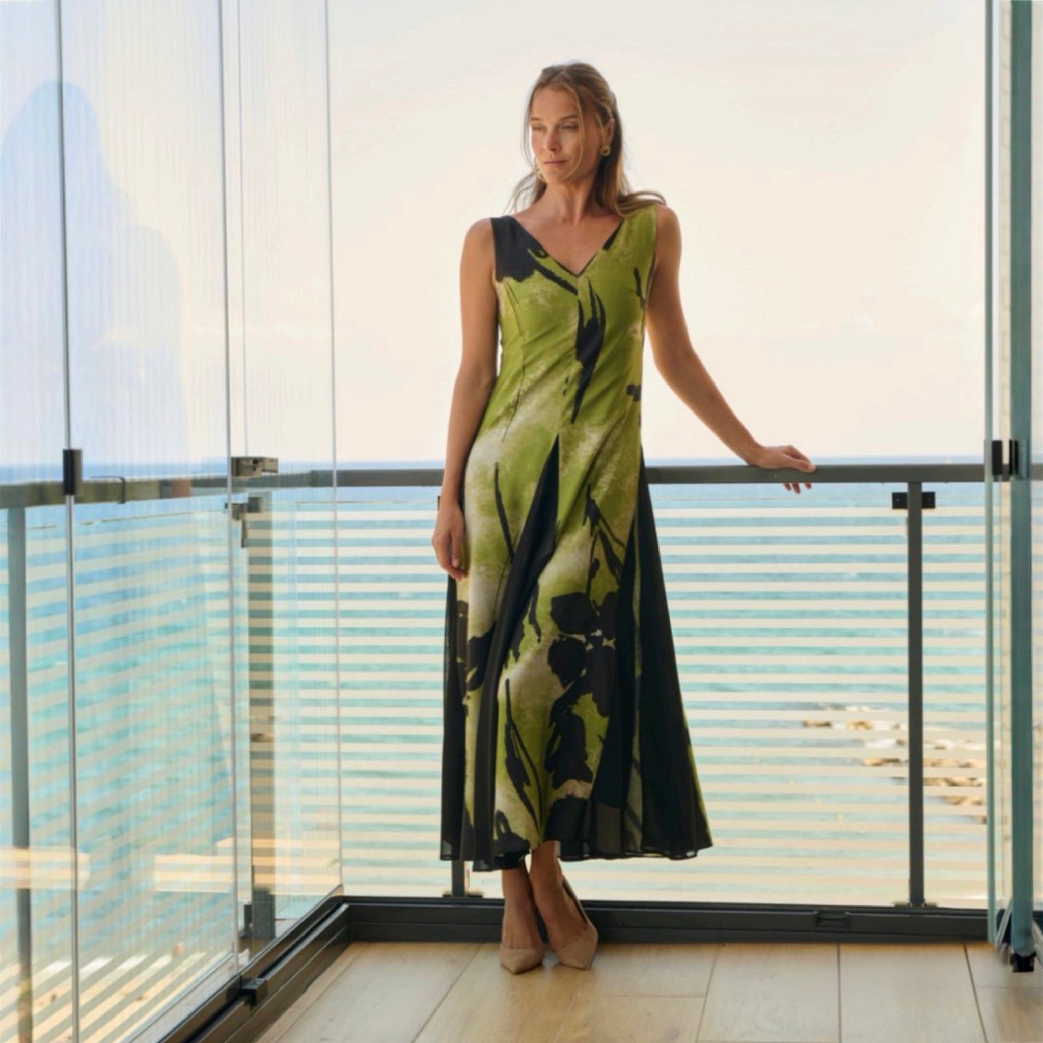 Este vestido estampado cuenta con un escote en pico y tirantes anchos, falda en forma evasé