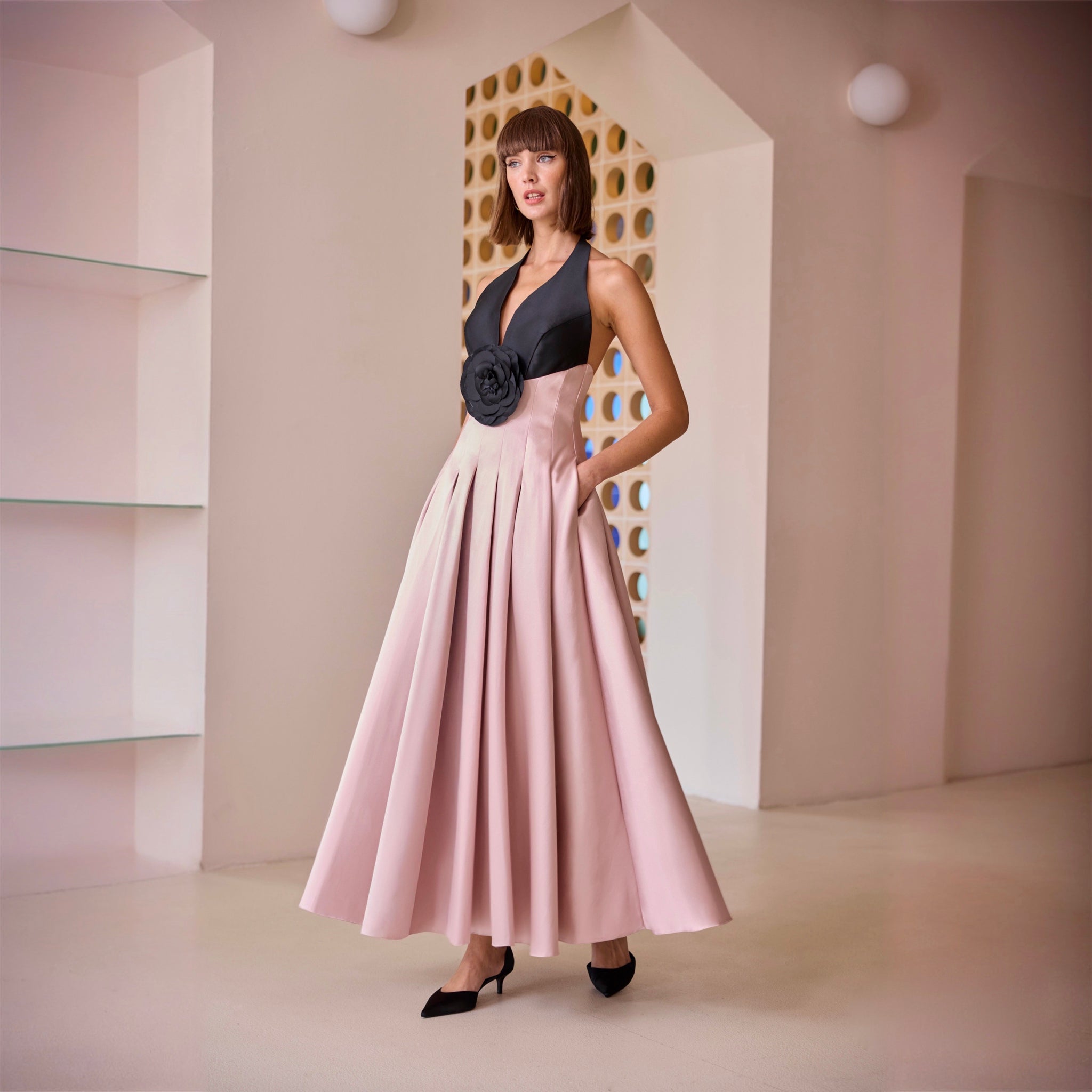 Este vestido combinado cuenta con un cuerpo de cuello halter, una elegante falda de vuelo con pliegues y detalle de flor, en mikado.