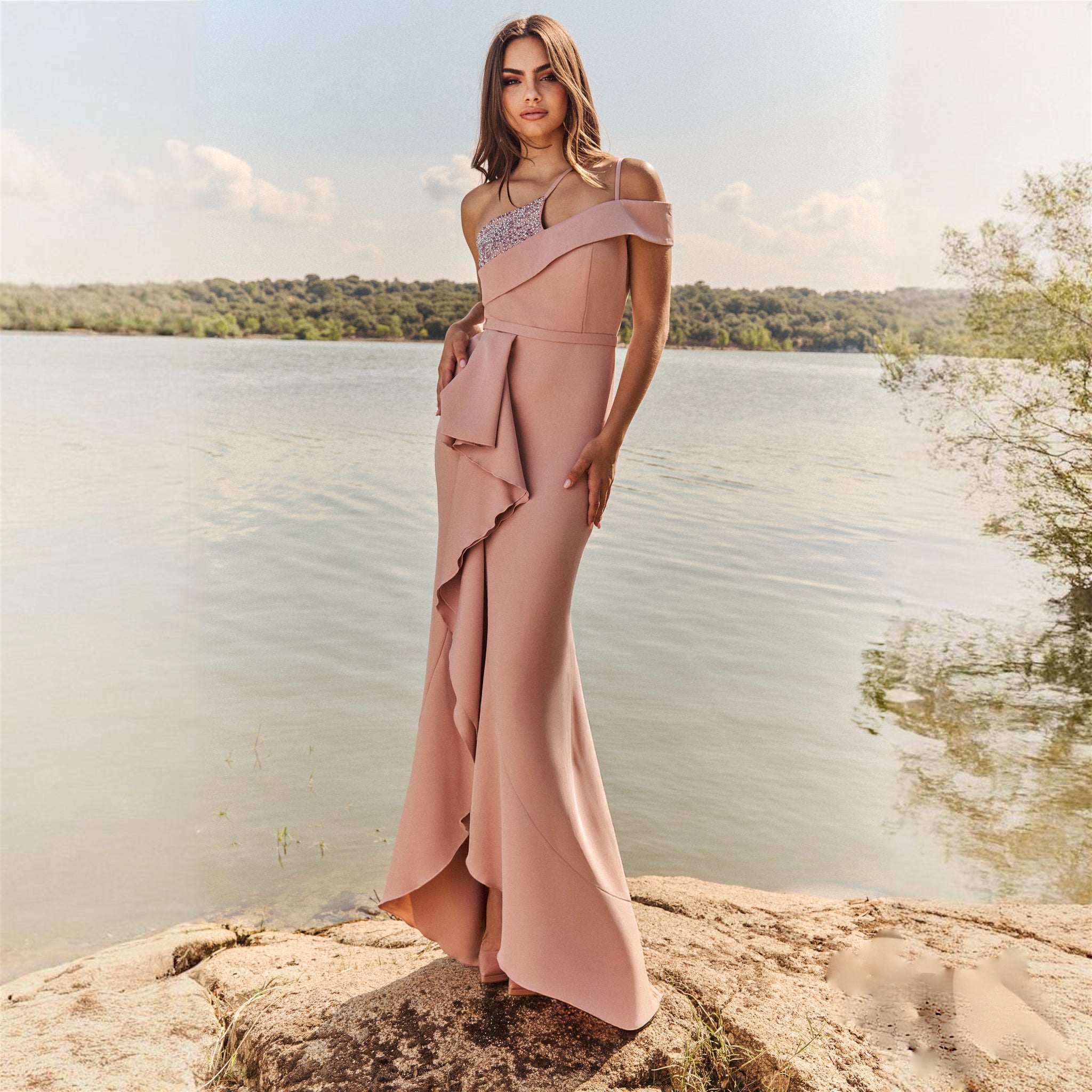 Este vestido cuenta con un escote asimétrico de un hombro caído con detalle en piedras, falda ajustada con volante desde cintura y abertura delante.