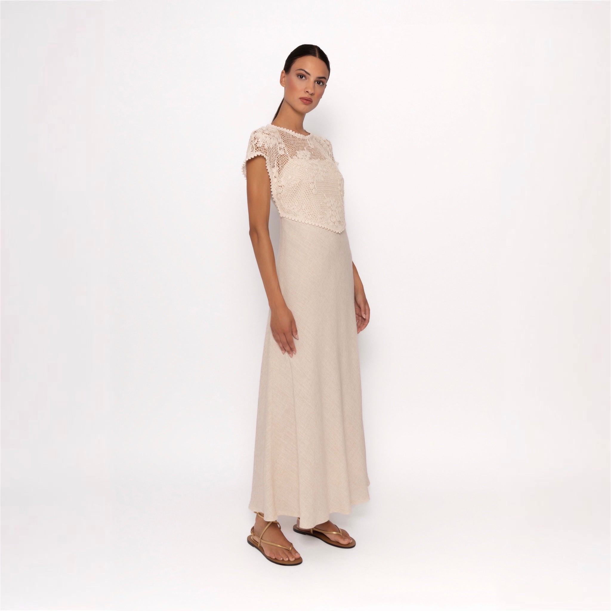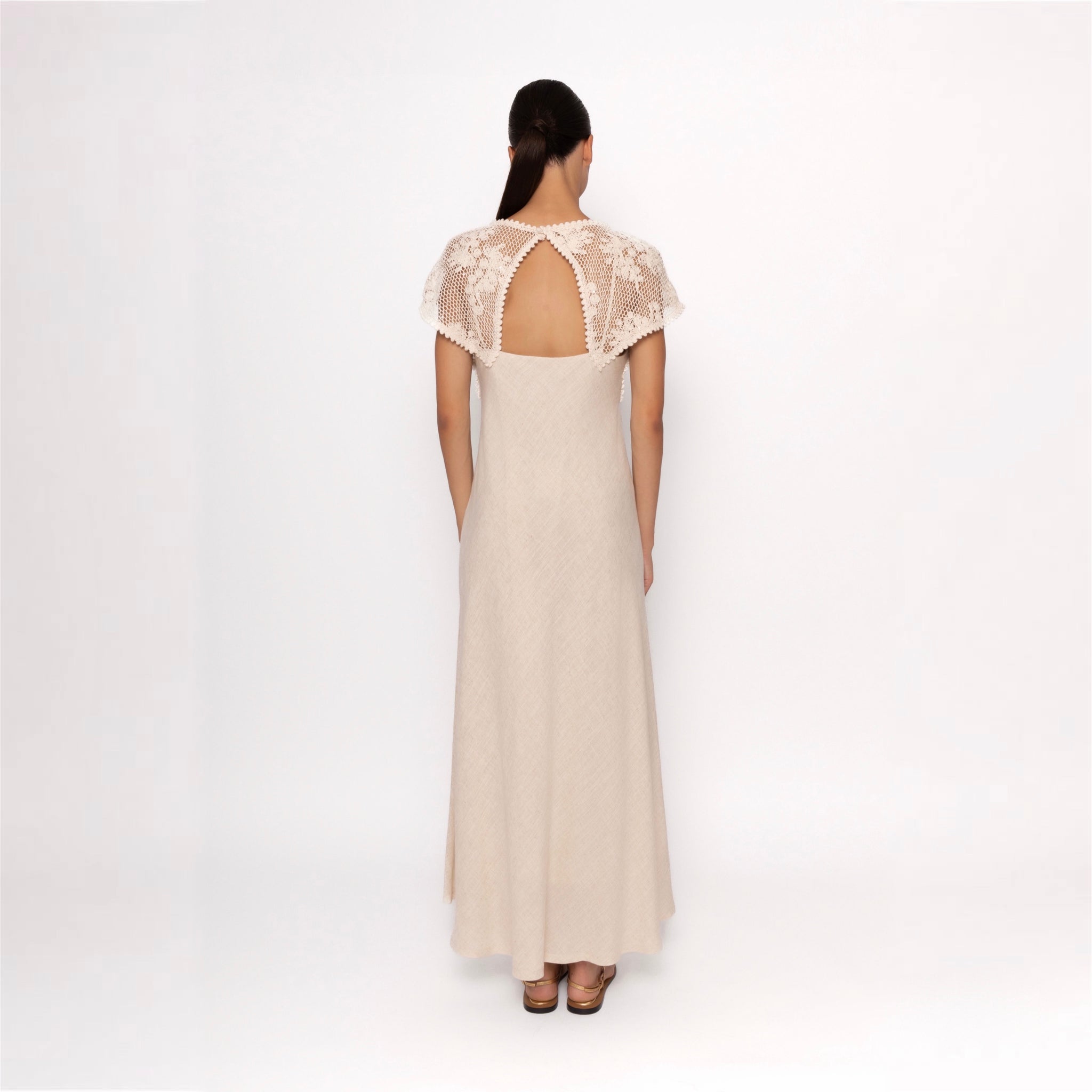 Este vestido cuenta con un cuerpo de guipur con mangas caídas y abierto en espalda, con una falda evasé.