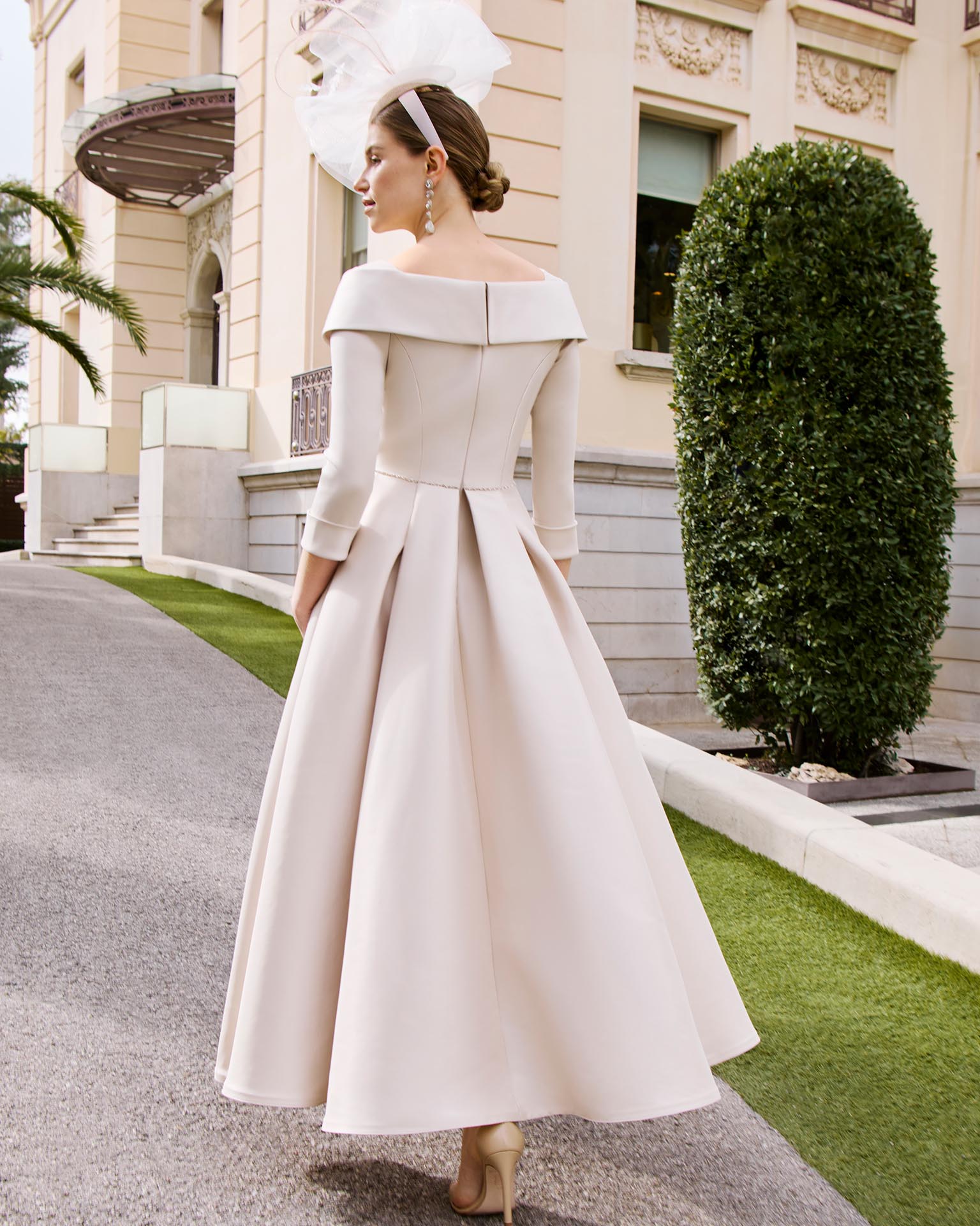 Este vestido de fiesta midi, confeccionado en mikado elástico. Con escote corazón, manga francesa y espalda cerrada