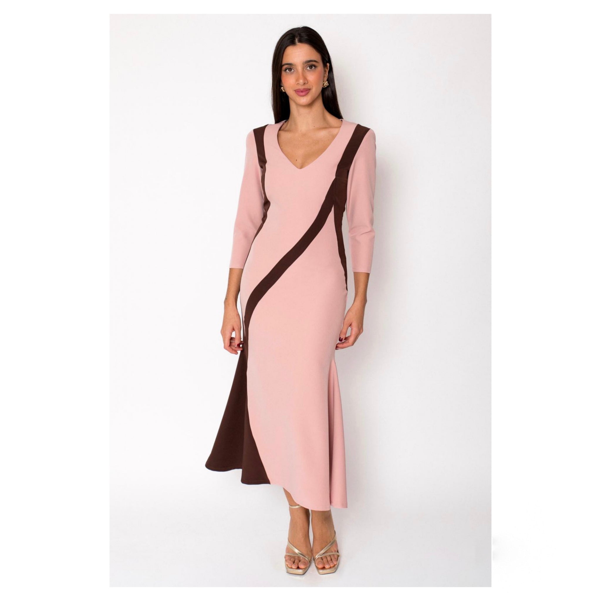 Este vestido combinado cuenta con un escote en V, mangas francesas y una falda con godets.